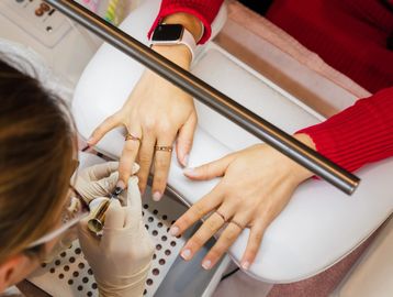 Dry manicure technique using an e-file and specialized bits to meticulously clean and remove dead cuticle skin around the nail plate. This results in an exceptionally clean finish, perfect for applying polish closer to the cuticle line.